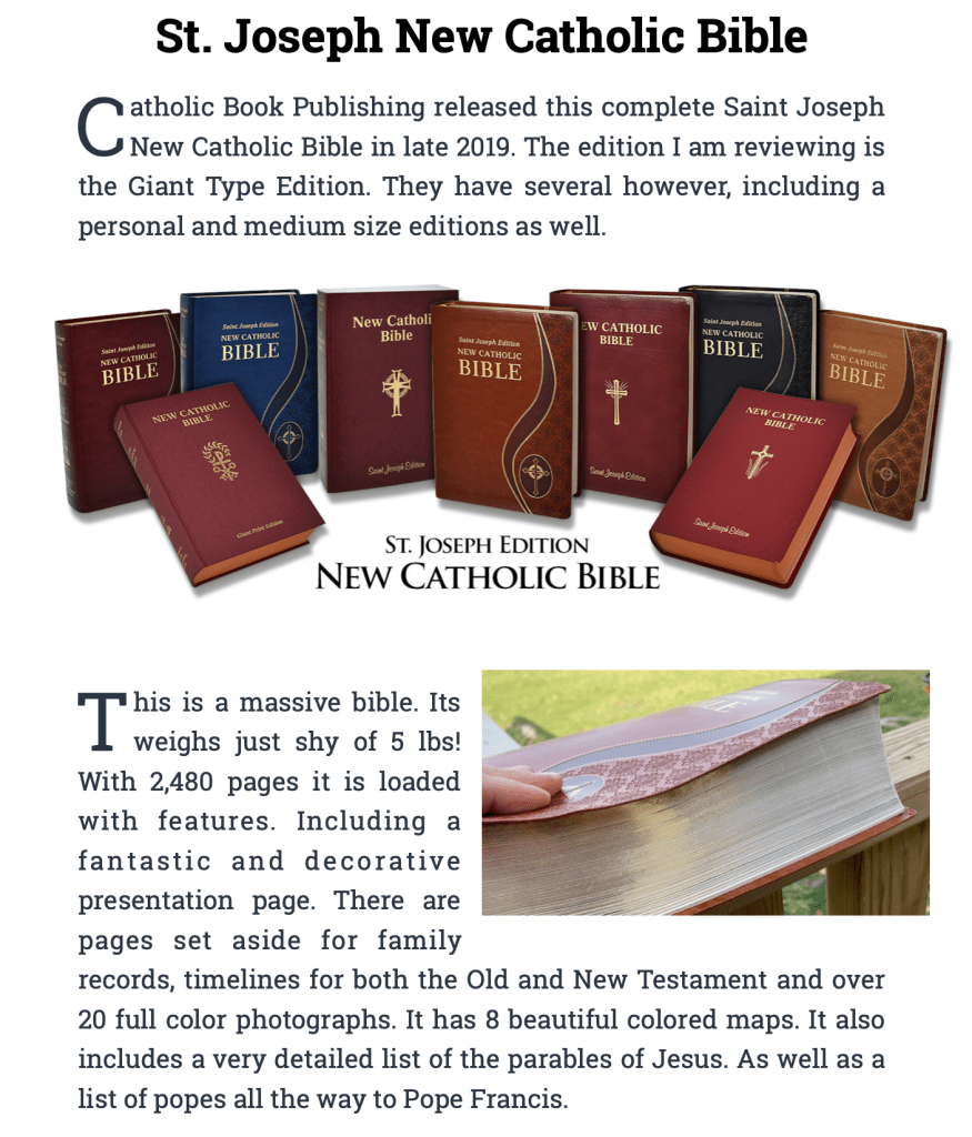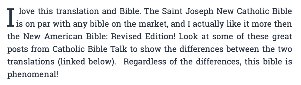 – I love this translation and Bible. The Saint Joseph New Catholic Bible is on par with any bible on the market, and I actually like it more then the New American Bible: Revised Edition! Look at some of these great posts from Catholic Bible Talk to show the differences between the two translations (linked below). Regardless of the differences, this bible is phenomenal!